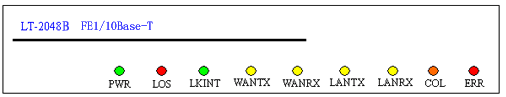 PWR 绿 电源指示 LOS 红 E1信号指示 亮 无信号 LKINK 绿 与HUB连接指示 亮 正常 WANTX 黄 广域网发数据指示 闪烁 在发数据 WANRX 黄 广域网收数据指示 闪烁 正在收数据 LANTX 黄 局域网发数据指示 闪烁 正在发数据 LANRX 黄 局域网收数据指示 闪烁 正在收数据 COL 红 局域网信号碰撞指示 闪烁 碰撞发生 ERR 红 网桥出错指示 闪烁 出错 | |
